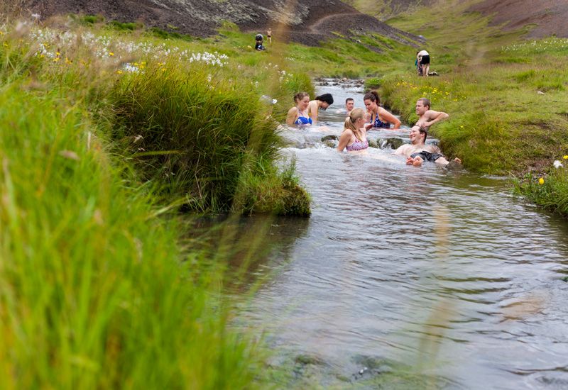 Dies ist ein berühmtes Gebiet, das sich während eines Erdbebens im Jahr 2008 dramatisch vergrößert hat. Auf dem Weg zu den grünen Berghügeln rund um den Vulkan Hengill haben wir gute Möglichkeiten, den „Tölt“, den besonderen Gang des Islandpferdes, zu probieren. Die Pferde bringen uns dann gemächlich auf schmalen Pfaden ins Tal Reykjadalur. Wir passieren den wunderschönen Wasserfall Djúpagilsfoss und einige heiße Quellen, bevor wir das Reykjadalur-Tal erreichen, und haben die Möglichkeit, ein entspannendes Bad in einem warmen Bach zu nehmen. Denken Sie also daran, Badebekleidung mitzubringen.